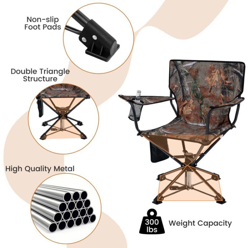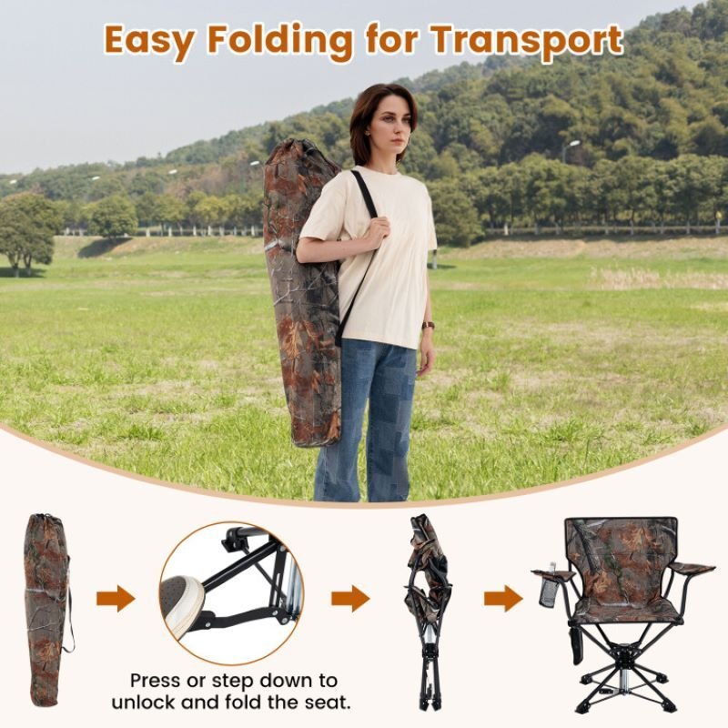 Relax in comfort and convenience with this 360° swivel portable chair. The smooth-rotating seat gives you a full view in any direction—perfect for camping, fishing, tailgating, or just lounging at home. Designed with an ergonomic backrest, armrests, and durable 600D Oxford fabric, it provides all-day comfort while holding up to 300 lbs. The foldable design and included carry bag make it easy to pack and take anywhere.