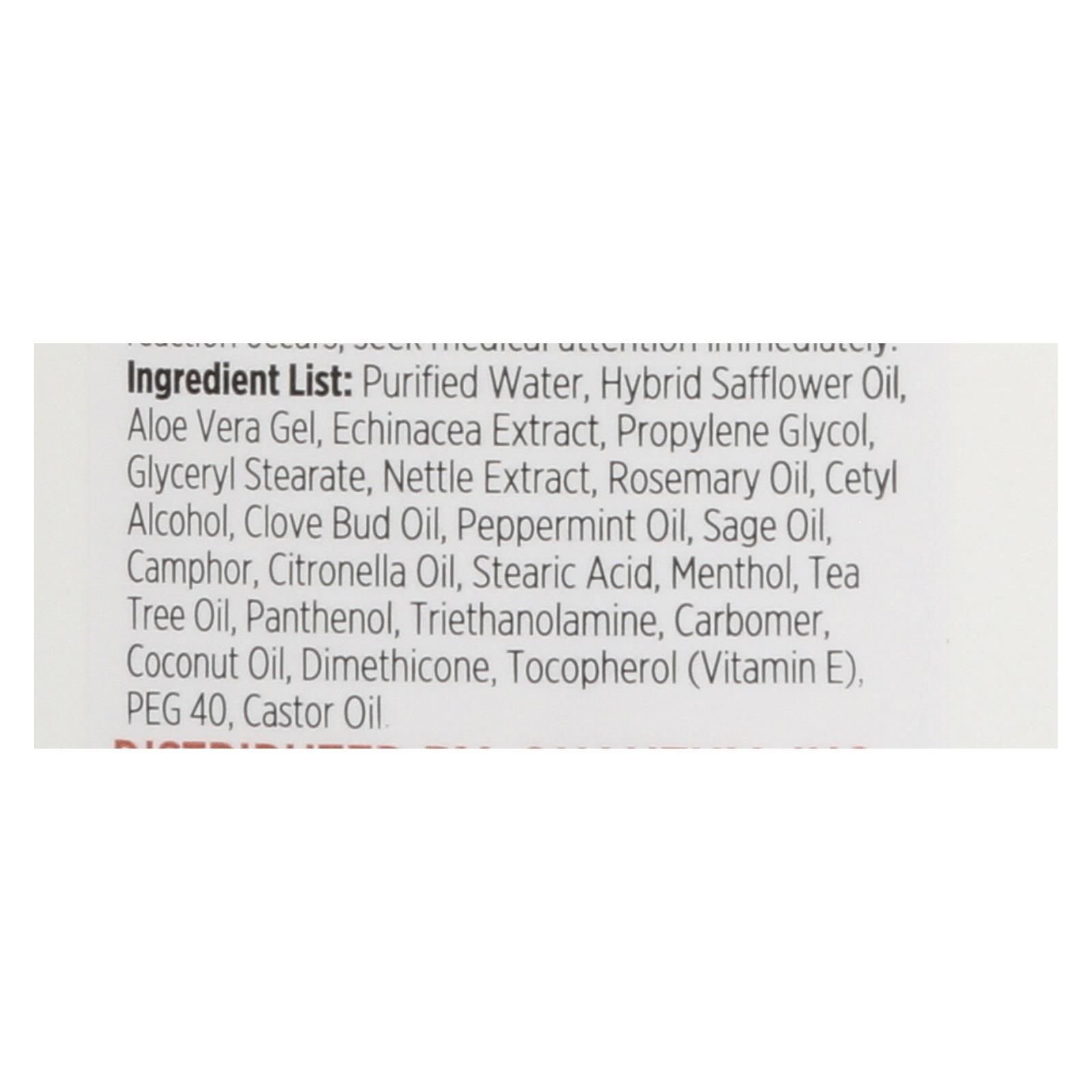 • Ingredients: Purified water, hybrid safflower oil, aloe vera gel, echinacea extract, menthol, peppermint oil, citronella oil, tea tree oil, and more.