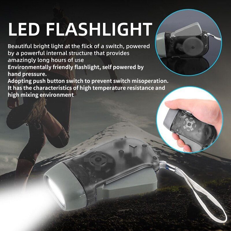• Dynamo Hand-Crank Power: No batteries required! Simply wind the handle to generate power for the LED flashlight.