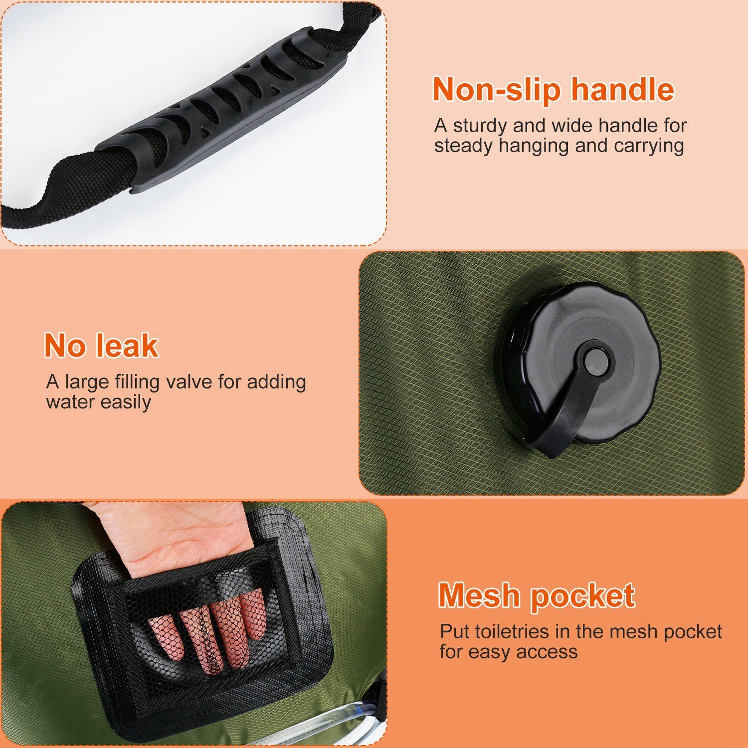 Humanized Design: Sturdy handle allows for hanging the bag on a tree to maximize the heating effect. The strap near the bottom helps keep the hose in place while you shower, and the mesh pocket allows for easy access to toiletries.