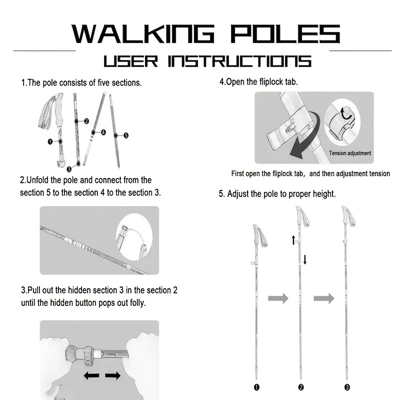 Designed for adventurers who need lightweight, durable, and high-performance trekking poles, these 5-section collapsible hiking poles are built to support all types of outdoor activities like mountain climbing, backpacking, and hiking. Made from aircraft-grade 7075 aluminum alloy, these poles are engineered to provide optimal stability and comfort without compromising portability. Whether you’re ascending a mountain or trekking through challenging terrain, these trekking poles are your perfect companion.