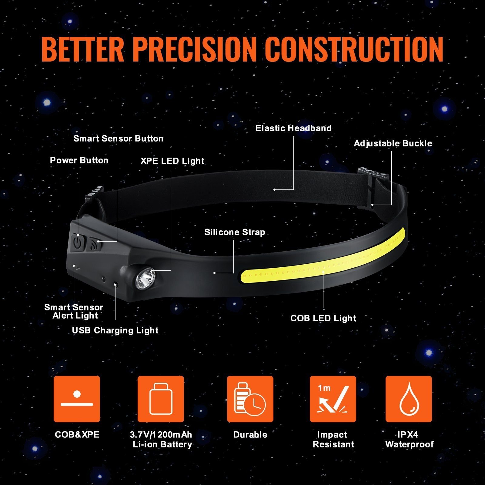Brighten your path and free your hands with the Vevor Rechargeable LED Headlamp, engineered for comfort, convenience, and performance. Designed with a wide 230° beam and motion sensor control, this lightweight headlamp ensures complete visibility and effortless operation—making it perfect for camping, hiking, running, biking, or working in dark spaces.